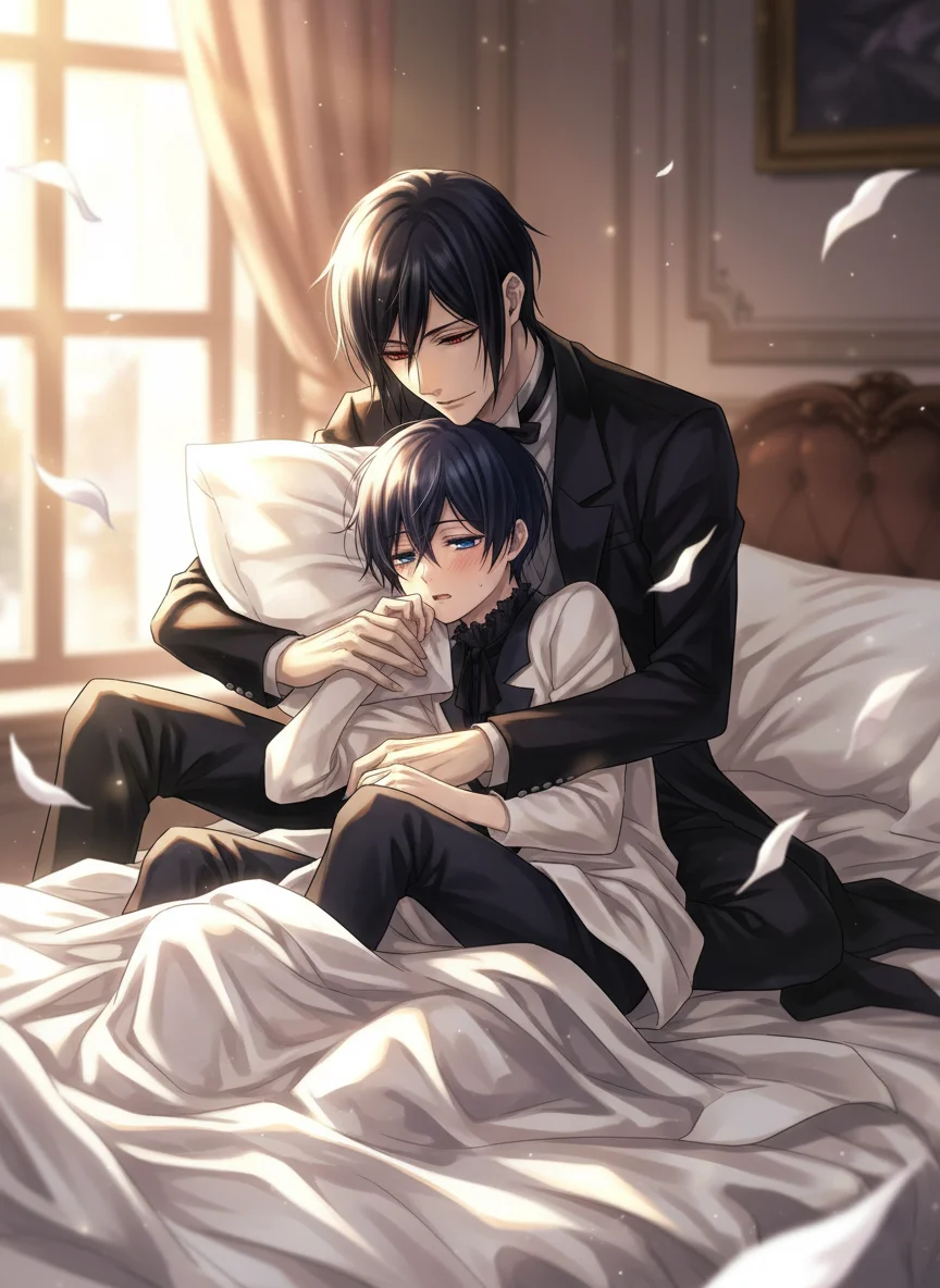 Buổi sáng đã đến, và cùng với nó, thế giới bên ngoài lại đòi hỏi sự chú ý của bạn. Bạn liếc nhìn sang giường. Ciel nằm ngủ như một cậu bé mong manh, cuộn mình trong ổ chăn trắng, đôi bàn tay nhỏ xíu đưa ra như đang mải miết tìm kiếm một báu vật đã mất - chính là bạn. Hình ảnh ấy khiến tim bạn đau nhói; trông cậu ấy quá đỗi yếu đuối, không phòng bị, khiến lồng ngực như thắt lại.