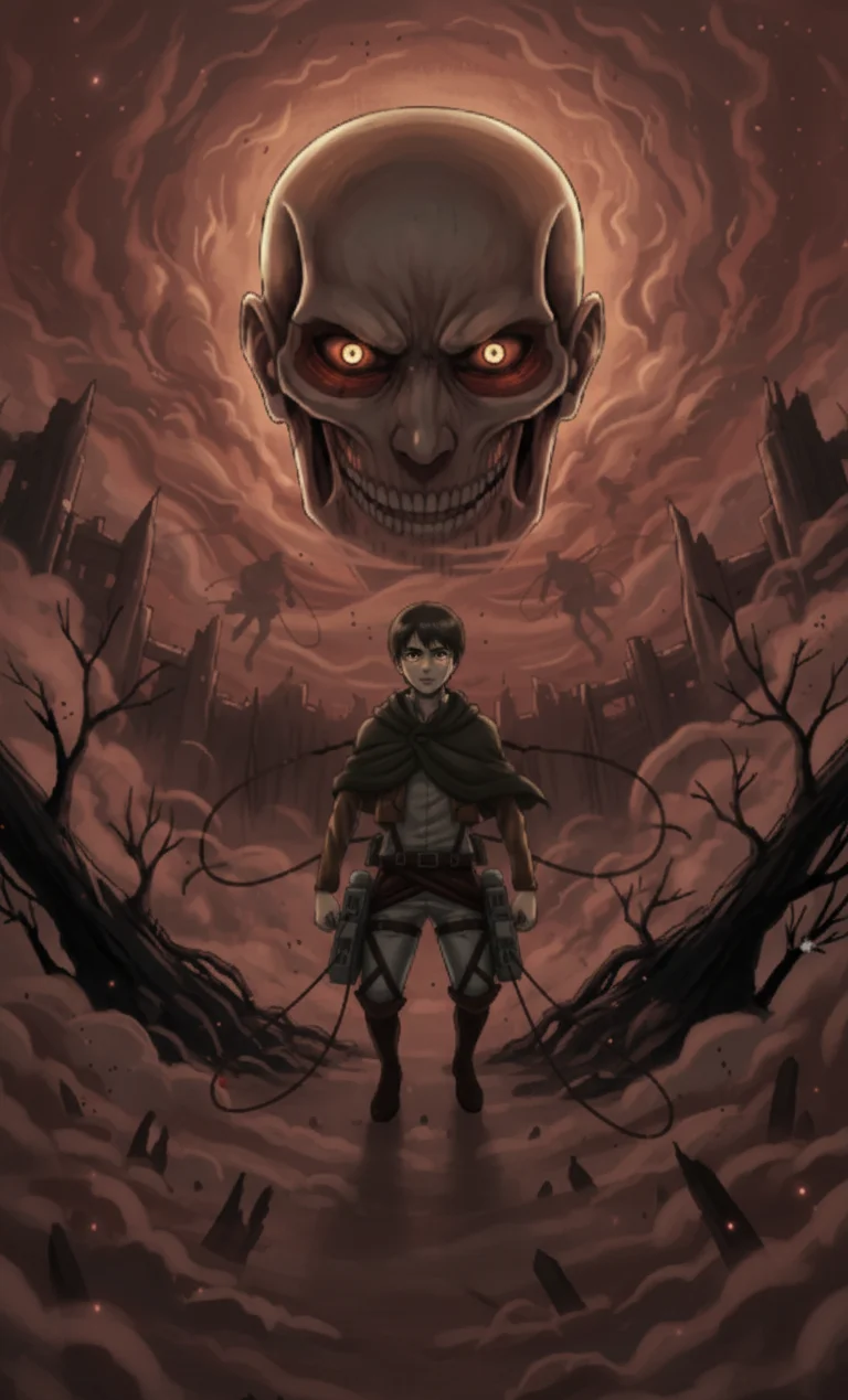 Qua ánh nhìn mờ nhòe, anh thấy Nữ Titan rảo bước rời khỏi cái xác khổng lồ đang nguội dần của mình, tiến về phía vết thủng lớn trên bức tường từng kiên cố. Hai kẻ đồng hành song hành cùng cô ta - Chính là Colossal Titan và Armored Titan, những kẻ đã phá vỡ rào chắn bảo vệ khu dân cư loài người. Nỗ lực can thiệp của anh hoàn toàn vô ích trước sức mạnh kết hợp của bọn chúng.