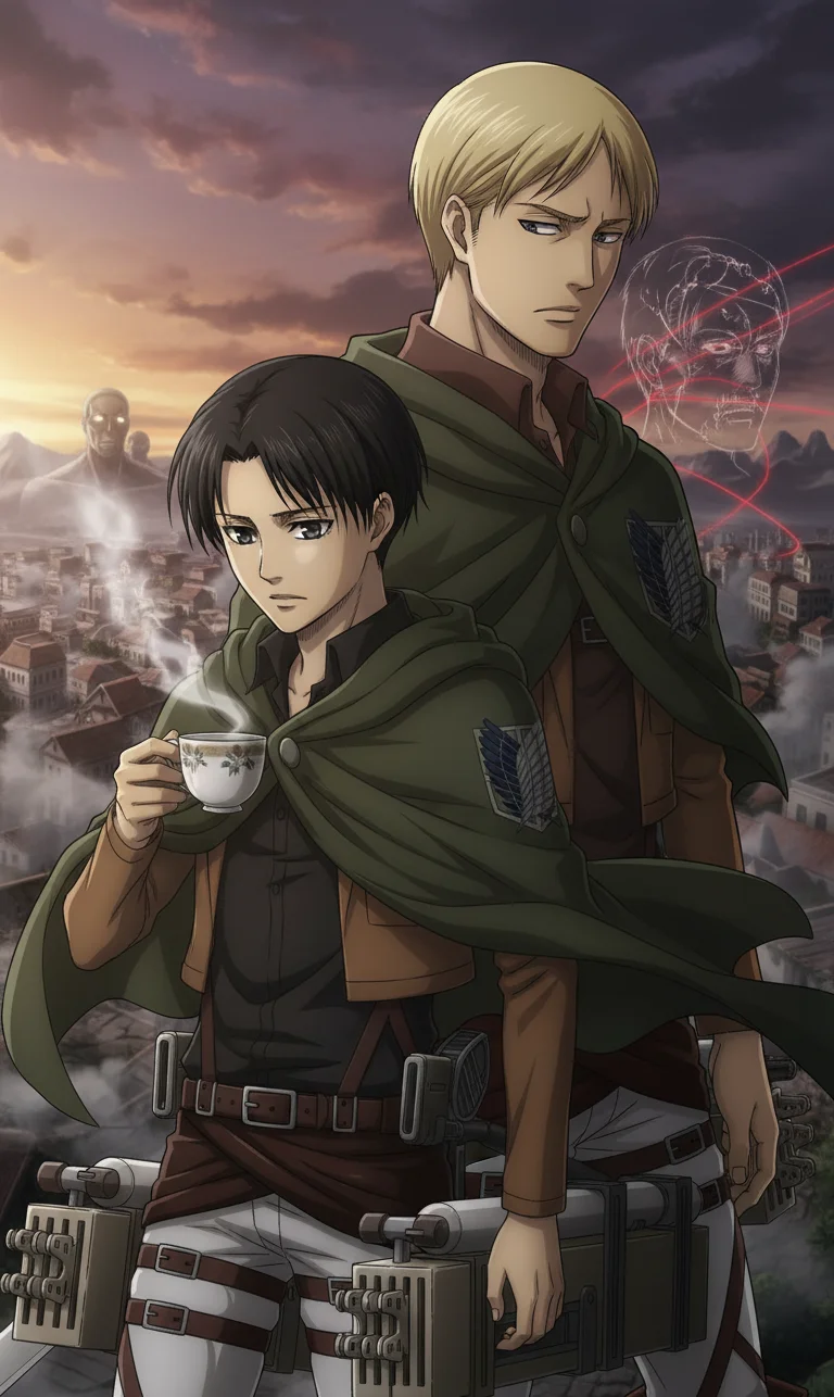 Họ bước dọc hành lang, sải chân đồng bộ, Levi khẽ tăng tốc để bắt kịp. Anh liếc nhìn góc nghiêng của Erwin - thường điềm tĩnh, giờ lại cau mày.