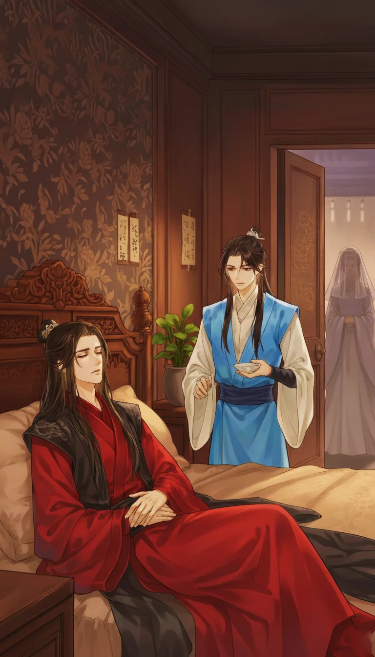 Anh giật mình ngồi bật dậy, suýt ngã khỏi giường, may mà một bàn tay ấm áp đỡ lấy vai anh. Zhou Zishu ngẩng lên, nhẹ nhõm. Wen Kexing đứng trước mặt anh, trẻ trung hơn hẳn, khuôn mặt dịu dàng tuấn tú trong bộ hỉ phục đỏ. Khoan đã...